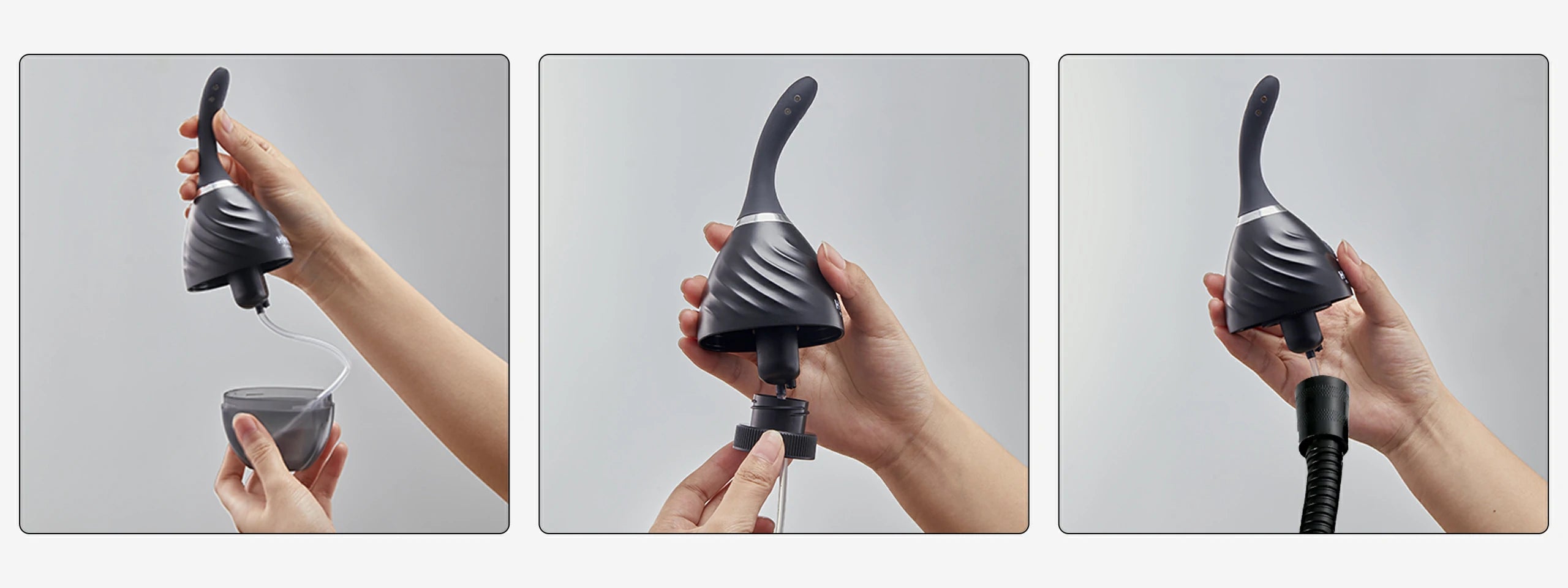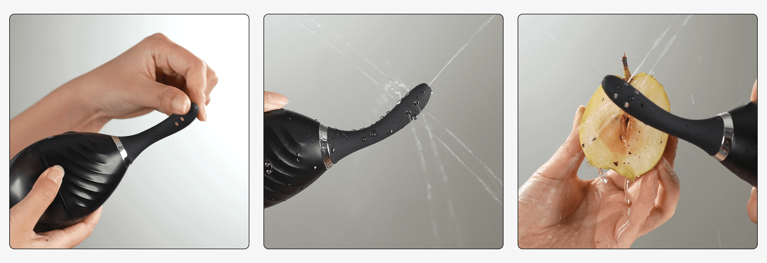 A curved, flexible nozzle features 9 outlet holes that spray in five directions, with 5 spraying speeds for a thorough cleanse before play, getting your rear spotless for all the dirty fun!